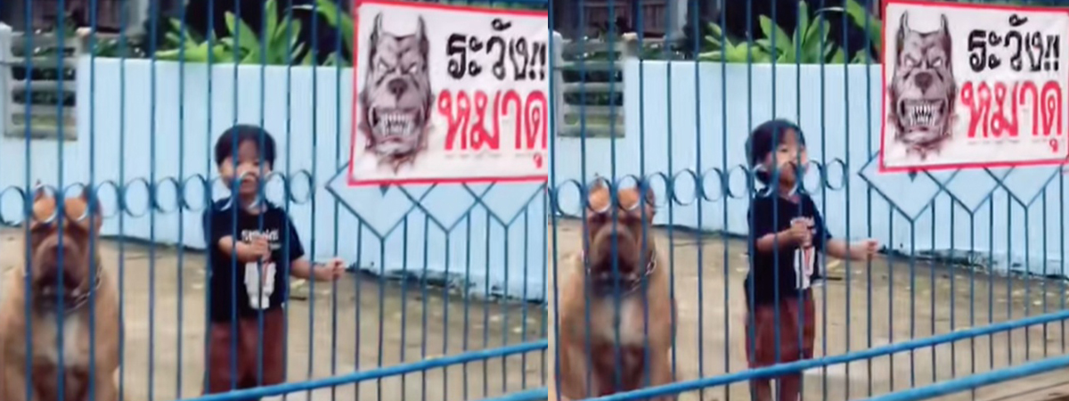 ผู้ใช้ TikTok @user00t2gh5d8n ได้เผยภาพตอนยืนอยู่ตรงบริเวณหน้าบ้านหลังหนึ่ง มีป้ายแปะเตือนเวลามีคนเดินผ่าน ให้ระวังหมาดุ ซึ่งแน่นอนว่าหมาที่เลี้ยงท่าทางดุมาก ๆ แต่พอมีคนอยู่หน้าบ้าน กลับยืนนิ่งเฉยซะงั้น แต่ที่ดุยิ่งกว่าไหงเป็นเด็กไปได้ ปีนประตูรั้วไม่พอ ยังทำเสียงเห่าใส่ด้วย เห็นแล้วถึงกับกลั้นขำไม่อยู่