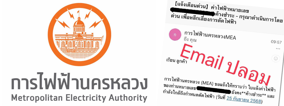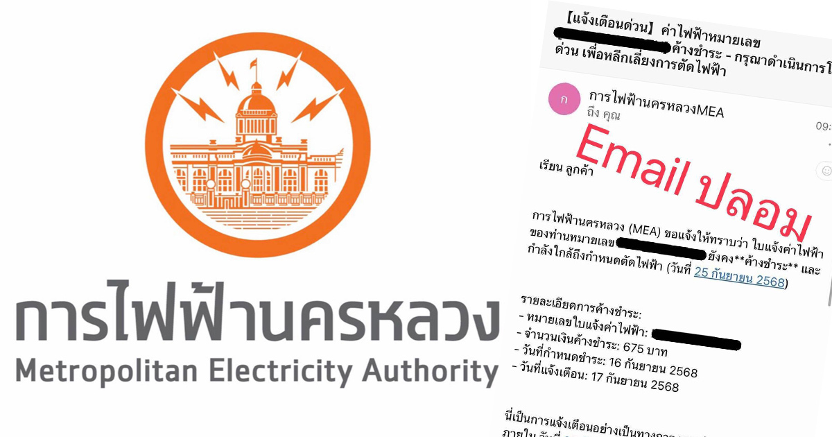 MEA หรือการไฟฟ้านครหลวง ขอแจ้งเตือนตามที่มีประชาชนได้รับข้อความ หรือจดหมายอิเล็กทรอนิกส์ (Email) แอบอ้างหน่วยงาน MEA เพื่อหลอกลวงโดยอ้างว่าผู้ใช้ไฟฟ้าค้างชำระค่าไฟฟ้า และหากไม่รีบชำระในเวลาที่กำหนดจะดำเนินการตัดไฟฟ้า จนอาจจะมีความเสี่ยงทำให้ประชาชนเสียทรัพย์สินนั้น จึงขอเน้นย้ำว่า MEA ส่งใบแจ้งค่าไฟฟ้าอิเล็กทรอนิกส์ทาง Email ทางการของ MEA เท่านั้น MEA e-bill (ebill@mea.or.th)