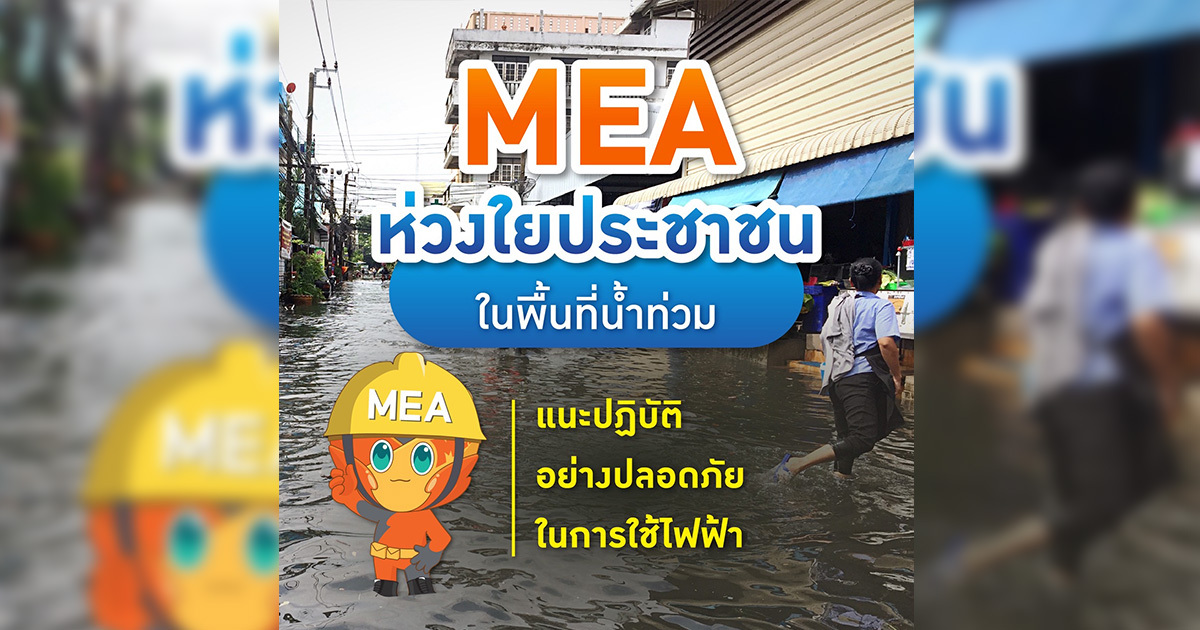 MEA หรือการไฟฟ้านครหลวง ห่วงใยพี่น้องประชาชนที่ได้รับผลกระทบจากสถานการณ์น้ำท่วมในหลายพื้นที่ ซึ่งเกิดจากภาวะฝนตกหนักและปริมาณน้ำที่เพิ่มสูงขึ้นอย่างต่อเนื่อง MEA ขอเตือนและแนะนำให้ประชาชนในเขตพื้นที่เสี่ยง หากระดับน้ำเริ่มท่วมสูงใกล้อุปกรณ์ไฟฟ้า ควรรีบย้ายปลั๊กไฟและเครื่องใช้ไฟฟ้าขึ้นที่สูงเพื่อป้องกันอันตรายจากไฟฟ้ารั่วและอุปกรณ์ชำรุด พร้อมติดตามสถานการณ์ข่าวสารอย่างใกล้ชิด