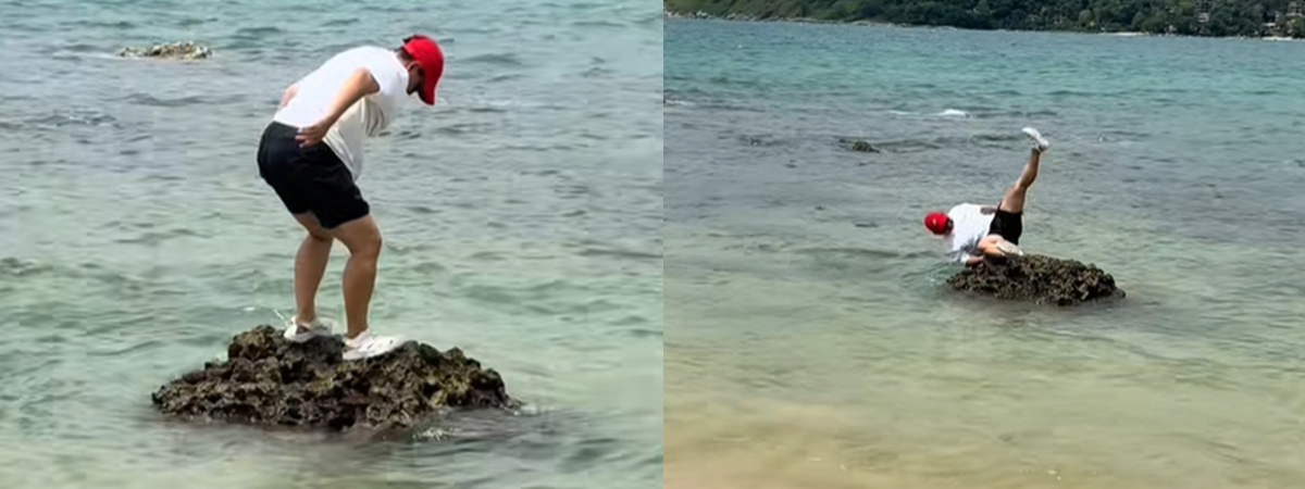 ผู้ใช้ TikTok @regge_antika ได้เผยภาพตอนไปเที่ยวบ้านเพื่อนที่ภูเก็ต แล้วเกิดอยากไปยืนบนโขดหิน กลางหาดยะนุ้ย ตอนขึ้นปีนไปอย่างดี แต่หลังจากนั้นดันลื่น หงายหลังกระแทกโดนโขดหิน และตกลงไปในน้ำทะเลเต็ม ๆ พอได้แผล ขึ้นฝั่งมาก็โดนด่าอีก งานนี้แทบอยากเอาหน้ามุดหนีไปเลยทีเดียว