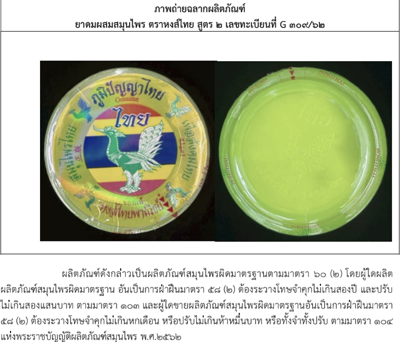 ด้วยสำนักงานคณะกรรมการอาหารและยา ได้เก็บตัวอย่างผลิตภัณฑ์สมุนไพร ยาดมผสมสมุนไพร ตราหงส์ไทย สูตร 2 เลขทะเบียนที่ G 309/62 จากสถานที่ผลิตผลิตภัณฑ์สมุนไพร หงส์ไทยพาณิชย์ ส่งตรวจวิเคราะห์ทางห้องปฏิบัติการ ณ กรมวิทยาศาสตร์การแพทย์ รายงานผลการตรวจวิเคราะห์ปรากฏว่า เป็นผลิตภัณฑ์สมุนไพรผิดมาตรฐานในรายการทดสอบการปนเปื้อนเชื้อจุลินทรีย์ Total Aerobic Microbial Count, Total Combined Yeasts and Mould Count และ Clostridium spp. ตามประกาศกระทรวงสาธารณสุข เรื่อง เกณฑ์มาตรฐาน ค่าความบริสุทธิ์ หรือคุณลักษณะอื่นอันมีความสำคัญต่อคุณภาพ สำหรับตำรับผลิตภัณฑ์สมุนไพรที่ขึ้นทะเบียน แจ้งรายละเอียด หรือจดแจ้ง พ.ศ. 2564 ดังนั้น เพื่อเป็นการคุ้มครองผู้บริโภค จึงเห็นควรประกาศผลการตรวจสอบผลิตภัณฑ์สมุนไพรให้ประชาชนทราบ