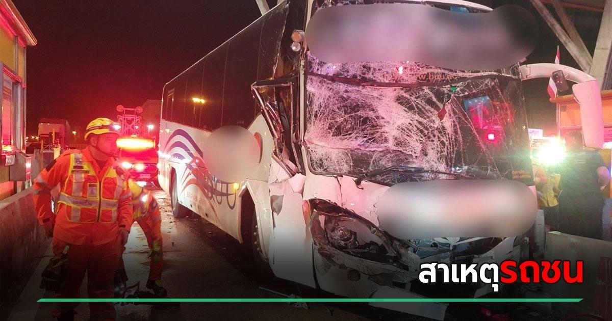 รถบัสมหาวิทยาลัย ชนท้ายอีกคันขณะจอดจ่ายเงินที่ด่านเก็บเงิน เจ็บ 41 ราย ดับ 1 ส่วนสาเหตุคือ เบรกไม่อยู่ เบรกแข็ง