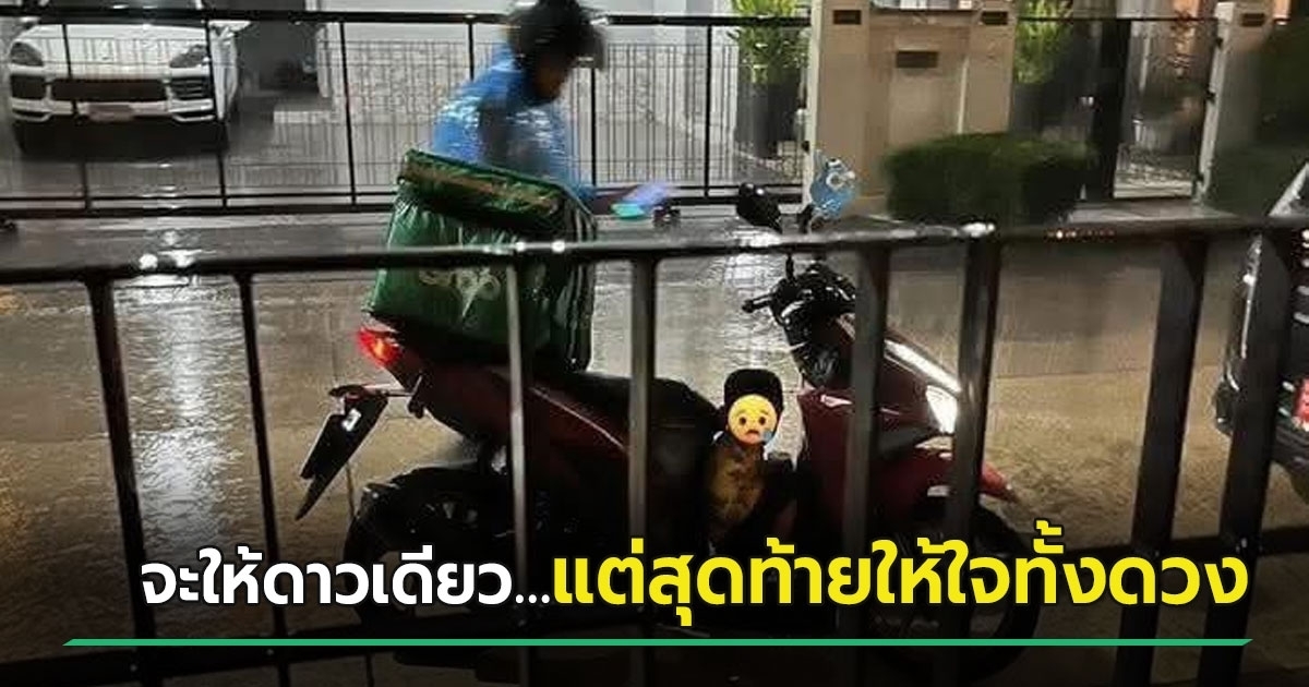 แต่พอเปิดประตูออกไป ภาพที่เห็นทำให้เธอถึงกับนิ่งค้าง ไรเดอร์ยืนเปียกฝนอยู่กลางสายฝน ส่วนที่พักเท้าของมอเตอร์ไซค์มีเด็กน้อยนั่งคุดคู้กอดเข่าหลบฝนอยู่เงียบ ๆ เธอบอกว่า "ตอนนั้นน้ำตาไหลทันที" จากที่โกรธกลายเป็นสงสาร ความรู้สึกทั้งหมดเปลี่ยนในพริบตาเดียว