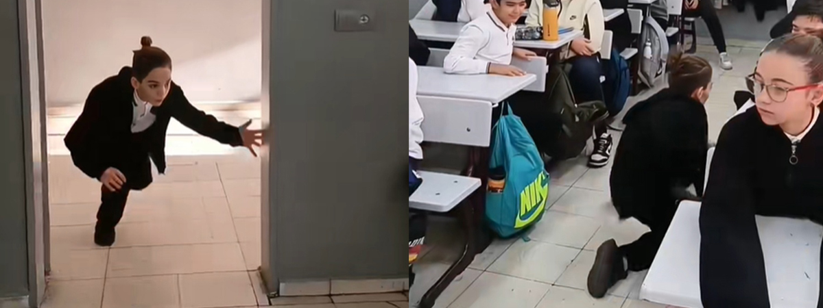 ผู้ใช้ TikTok @dostcengiz ได้เผยภาพนักเรียนคนหนึ่ง มาสายจนเพื่อนคนอื่น ๆ นั่งอยู่ในห้องเรียนกันหมด เพื่อไม่ให้ครูรู้ว่าเข้าห้องเรียนสาย เลยใช้สกิลเข้าห้องแบบหลบหลีกขั้นสุด พยายามแล้วแต่สุดท้าย ดันโป๊ะเข้าให้ นึกว่าจะรอด หันไปเห็นครูนั่งข้าง ๆ พอดี งานนี้จบกัน