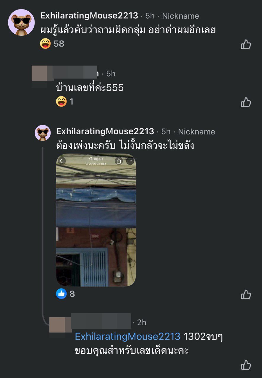 ล่าสุด ทางเจ้าของโพสต์ถึงกับต้องรีบเข้าไปขอโทษเพื่อน ๆ ในกลุ่ม โดยบอกว่า "ผมรู้แล้วคับว่าถามผิดกลุ่ม อย่าด่าผมอีกเลย" และเพื่อเป็นการชดเชย เขายังได้โพสต์ภาพเลขที่บ้านเอาไว้ให้ด้วย ซึ่งมีชาวเน็ตตาดีช่วยเพ่งให้แล้วว่าเป็นเลข "1302" พร้อมขอบคุณสำหรับเลขเด็ดงวดนี้