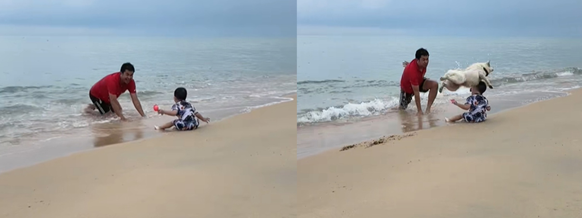 มาแบบไม่ทันตั้งตัว พ่อนั่งเล่นกับลูก ตรงริมทะเล อยู่ ๆ ก็โผล่มาจากไหนไม่รู้ เหยียบหัวลูกเต็ม ๆ
