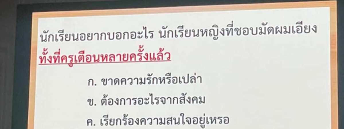 ผู้ใช้ TikTok @urrw_403 ได้เผยภาพคุณครูท่านหนึ่ง กำลังเผยโจทย์ข้อสอบ พร้อมเอาขึ้นหน้าจอให้นักเรียนเห็นชัด ๆ อ่านโจทย์ว่าอึ้งแล้ว พอมาเห็นคำตอบที่ให้เลือกแต่ละข้อ ทำนักเรียนอึ้งยิ่งกว่า เพราะเหมือนด่ายังไงก็ไม่รู้ หลังจากที่ภาพดังกล่าวเผยแพร่สู่สายตาโลกโซเชียล ก็เกิดการวิพากษ์วิจารณ์ให้พรึ่บ พร้อมกับสงสัยว่าครูสอนวิชาอะไร และทำไมถึงออกโจทย์อะไรแบบนี้