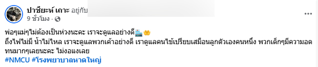 พร้อมระบุข้อความว่า "พ่อ ๆ แม่ ๆ ไม่ต้องเป็นห่วงนะคะ เราจะดูแลอย่างดี ถึงไฟไม่มี นํ้าไม่ไหล เราจะดูแลพวกเค้าอย่างดี เราดูแลคนไข้เปรียบเสมือนลูกตัวเองคนหนึ่ง พวกเด็ก ๆ มีความอดทนมาก ๆ เลยนะคะ ไม่งอแงเลย #NMCU #โรงพยาบาลหาดใหญ่"