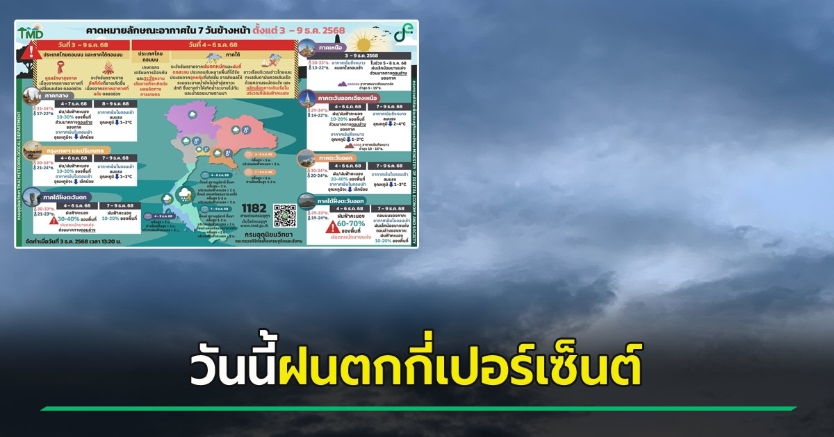 กรมอุตุนิยมวิทยา เผยข้อมูลพยากรณ์อากาศ 5 ธันวาคม 2568 ถึงช่วง 7 วันข้างหน้า ไทยมีฝนกี่เปอร์เซ็นต์ ก่อนตอนบนเตรียมหนาวอีกเร็ว ๆ นี้