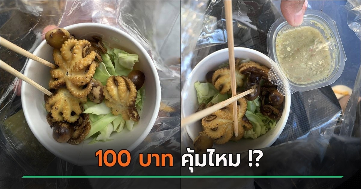จากภาพเผยให้เห็นเมนูหมวกหมึกย่าง ถูกเสิร์ฟมาในถ้วยกระดาษ ด้านล่างมีผักวางไว้จนเต็ม แต่เมื่อลองเปรียบเทียบขนาดกับมือลูกค้า พบว่าหมึกแต่ละตัวค่อนข้างเล็ก ซึ่งในถ้วยนั้นมีเพียง 4 ตัว และถูกขายในราคา 100 บาท
