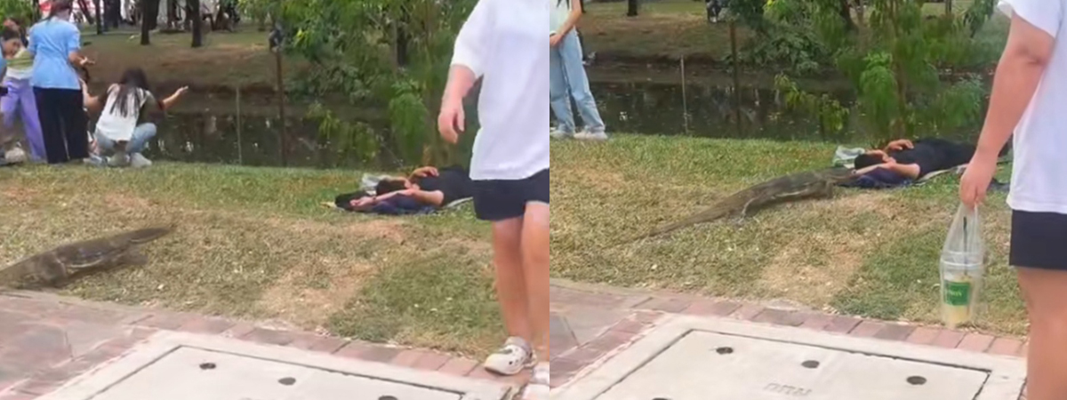 ผู้ใช้ TikTok @kamonwan_.s ได้เผยภาพบรรยากาศในสวนลุมพินี ที่กำลังจัดงานกาชาด มีผู้คนมาเดินเที่ยวมากมาย ระหว่างเดินเห็นหนุ่มคนหนึ่ง เอาเสื่อมาปูนอนรับลมธรรมชาติริมน้ำ แต่ก็เกิดเหตุการณ์ที่ทำให้ผู้คนแตกตื่น มีตัวเงินตัวทองปรากฏตัว เดินเข้าหาชายหนุ่มที่กำลังหลับ กว่าจะมีคนมาช่วยปลุก มันได้สัมผัสตัวเขาแบบเต็ม ๆ