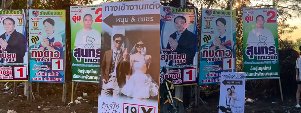 เลือกพรรคเรา รักจริง แต่งจริง เห็นป้ายหาเสียงข้างทาง แต่มีป้ายหนึ่ง แอบเนียนไปกับเขาด้วย