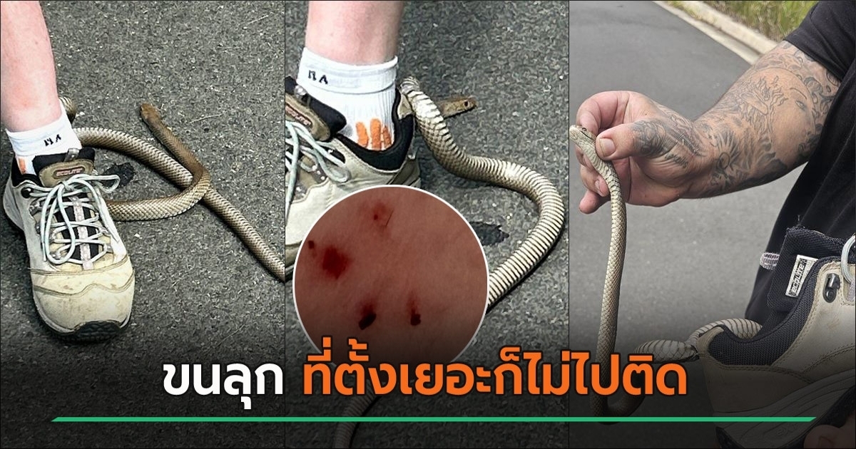 หญิงออสเตรเลียช็อก นึกว่าเชือกรองเท้าหลุดพาดขา พอก้มดูถึงกับเข่าอ่อนอสรพิษร้ายติดแน่นคาส้นรองเท้ากู้ภัยรุดช่วยระทึกกลางแดดร้อนจัด