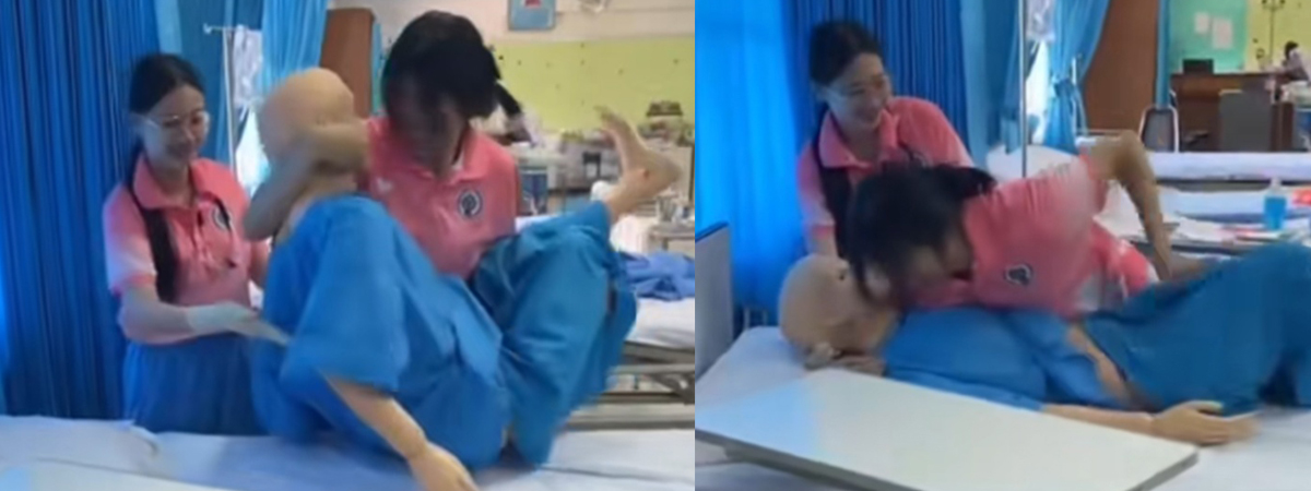 ผู้ใช้ TikTok @the_gang303 ได้เผยภาพนักศึกษาพยาบาลชั้นปี 3 กำลังฝึกรักษาคนไข้กับหุ่นจำลอง จังหวะอุ้มคนไข้นอนบนเตียง ก็ต้องช่วยกันประคอง เกือบทำคนไข้ไม่รอด แล้วตอนพีคอยู่ช่วงตอนดึงตัวคนไข้ให้นอนถูกที่ เหมือนมือไม่ได้ตั้งใจดึงกางเกง เห็นเต็ม ๆ ตา ดันไปดูของคนไข้ซะงั้น งานนี้ฮาลั่นห้องพยาบาลเลยทีเดียว
