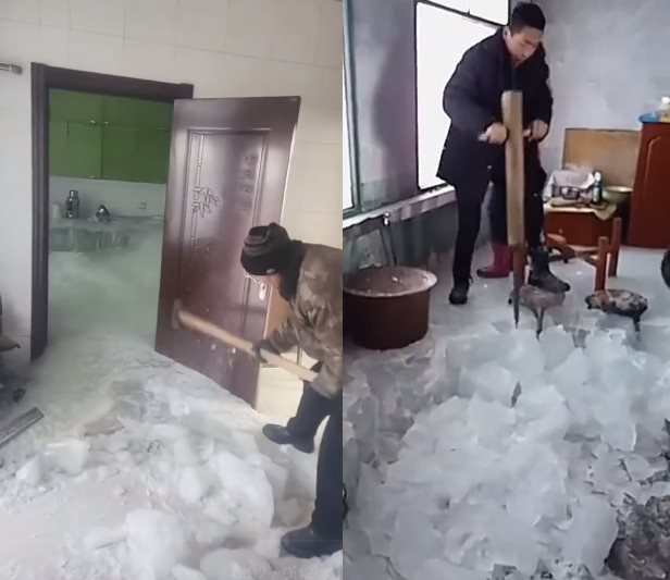 รายงานเผยว่า เหตุการณ์เกิดขึ้นเมื่อวันที่ 3 มกราคม ที่ผ่านมา ที่บ้านหลังหนึ่งในมณฑลเฮย์หลงเจียง ทางตะวันออกเฉียงเหนือของประเทศจีน จากคลิปวิดีโอที่ถูกนำมาเผยแพร่แสดงให้เห็นว่า ครอบครัวได้กลับมาที่บ้าน ก่อนจะพบว่า น้ำจากก๊อกในครัวแข็งตัวเป็นน้ำแข็ง น้ำในอ่างล้างจานล้นท่วมลงมาที่พื้นก็กลายเป็นน้ำแข็งหนามากกว่าครึ่งเมตร