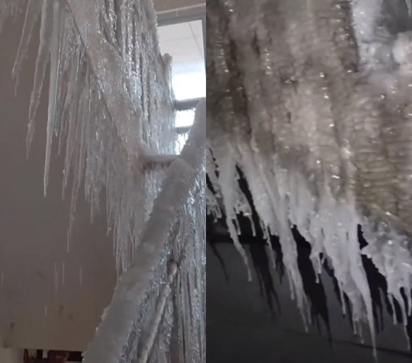 น้ำจากก๊อกน้ำได้ไหลทะลักท่วมบ้านไปยังห้องอื่น ๆ จนกลายเป็นน้ำแข็งไปทั่วบริเวณ เครื่องใช้ไฟฟ้า เฟอร์นิเจอร์ต่าง ๆ ถูกฝังอยู่ใต้ชั้นน้ำแข็งหนา ท่อน้ำก็กลายเป็นแท่งน้ำแข็ง รวมไปถึงผนังห้องต่าง ๆ และที่บันได ราวบันได และเพดาน ยังเต็มไปด้วยน้ำแข็งห้อยย้อยราวกับถ้ำน้ำแข็ง ทางครอบครัวต่างพากันออกแรงใช้อุปกรณ์แซะน้ำแข็งอย่างยากลำบาก