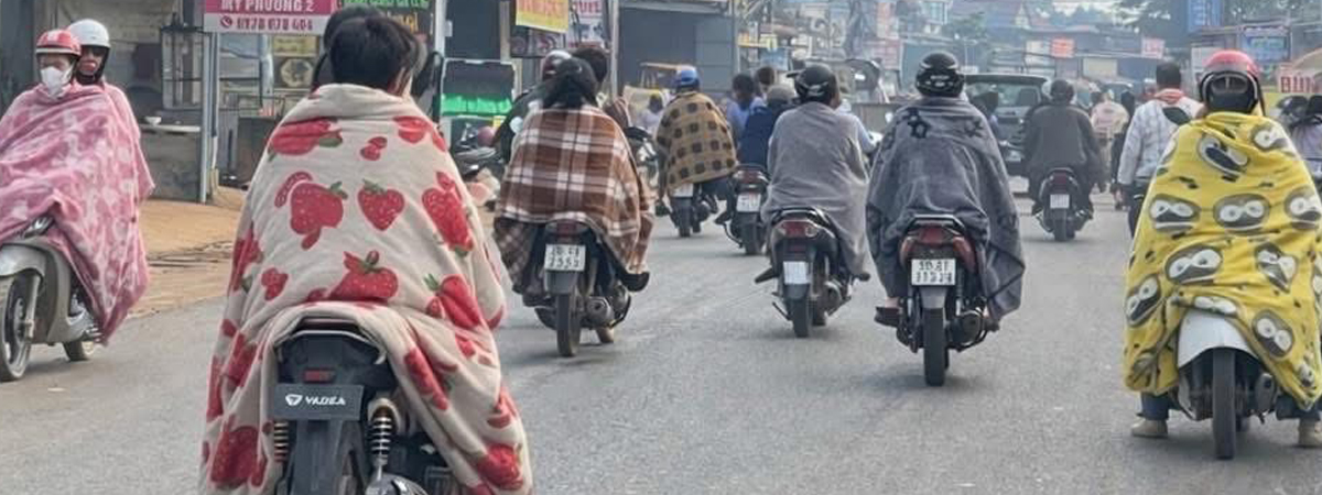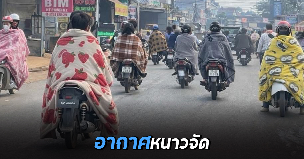 เฟซบุ๊ก xuanhiep.2019 ได้เผยภาพสถานการณ์จากประเทศเวียดนาม ที่กำลังเผชิญกับอากาศหนาวเย็นขั้นสุด อุณหภูมิอยู่ในระดับเลขตัวเดียวเลยก็ว่าได้ แต่สิ่งที่คนเวียดนามเขาทำกัน เวลาออกไปข้างนอก ปกติต้องใส่เสื้อกันหนาว แต่พวกพี่เล่นเอาผ้าห่มมาใช้ซะคุ้มเลย