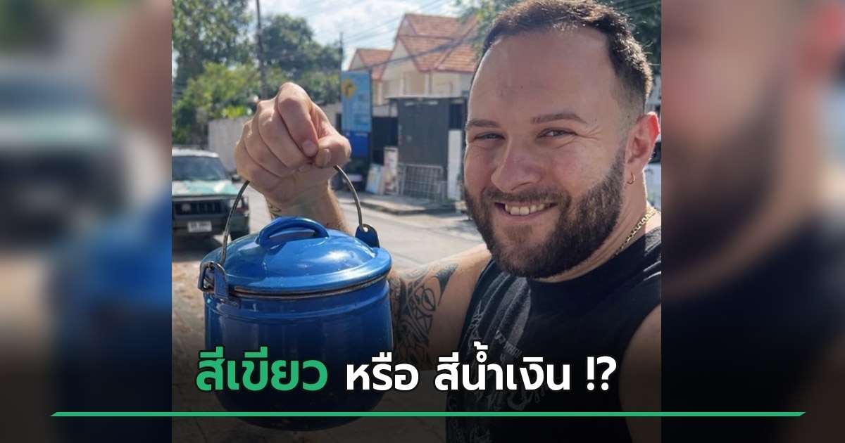 จากภาพจะเห็นว่าเจ้าตัวยืนถือหม้อ "สีน้ำเงิน" อยู่ในมือ แต่หม้อดังกล่าวนี้แม่ของแฟนยืนยันว่ามันคือ "สีเขียว" ทำเอาชาวต่างชาติถึงกับงงว่ามันคือสีเขียวตรงไหนครับเนี่ย