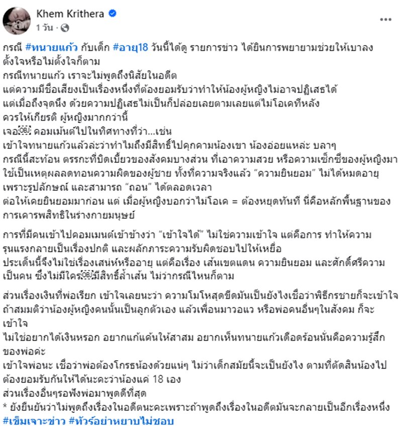 สำหรับข้อความทั้งหมด เข็ม ระบุว่า "กรณี #ทนายแก้ว กับเด็ก #อายุ18 วันนี้ได้ดู รายการข่าว ได้ยินการพยายามช่วยให้เบาลงตั้งใจหรือไม่ตั้งใจก็ตาม กรณีทนายแก้ว เราจะไม่พูดถึงนิสัยในอดีต แต่ความมีชื่อเสียงเป็นเรื่องหนึ่งที่ต้องยอมรับว่าทำให้น้องผู้หญิงไม่อาจปฏิเสธได้แต่เมื่อถึงจุดนึง ด้วยความปฏิเสธไม่เป็นก็ปล่อยเลยตามเลยแต่ไม่โอเคทีหลังควรให้เกียรติ ผู้หญิงมากกว่านี้ เจอคอมเมนต์ไปในทิศทางที่ว่า… เช่นเข้าใจทนายแก้วแล้วล่ะว่าทำไมถึงมีสิทธิ์ไปคุกคามน้องเขา น้องอ่อยแหละ บลา ๆ