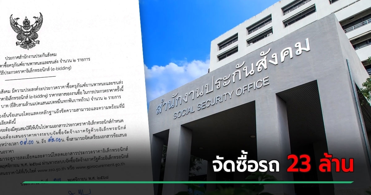 เอกสารที่ถูกเผยแพร่เป็น ประกาศสำนักงานประกันสังคม เรื่อง ประกวดราคาซื้อครุภัณฑ์ยานพาหนะและขนส่ง จำนวน 2 รายการ ด้วยวิธีประกวดราคาอิเล็กทรอนิกส์ (e-bidding) วงเงินงบประมาณรวม 23,886,000 บาท โดยระบุชัดว่าเป็นการจัดซื้อรถเพื่อใช้งานตามภารกิจของสำนักงาน ประกอบด้วย