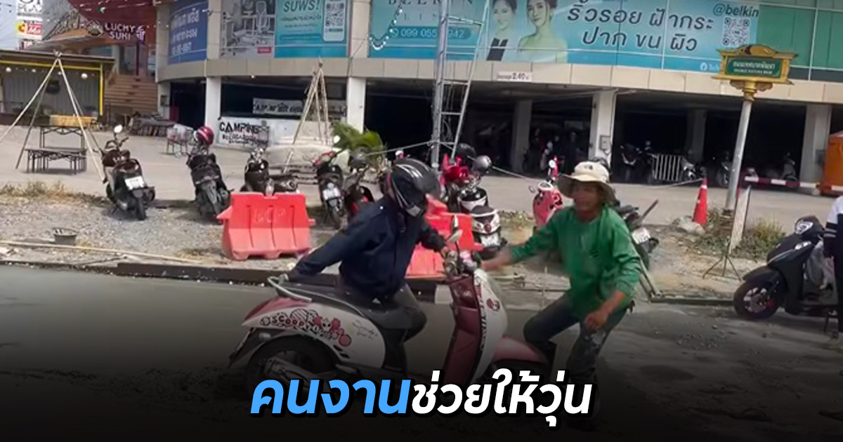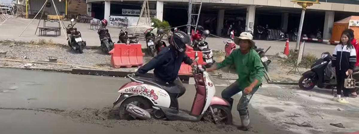 เฟซบุ๊ก Kittiphan Juntasee ได้เผยภาพตอนขับรถผ่านถนนเส้นหนึ่ง ที่มีคนงานก่อสร้างมาปูคอนกรีตถนนใหม่ แต่กลับเกิดเหตุที่ใคร ๆ คาดไม่ถึง มีมอเตอร์ไซค์คันหนึ่ง ไม่รู้ขับมายังไง ล้อจมคอนกรีตเป็นที่เรียบร้อย คนงานพากันเห็น รีบไปช่วยทันที มีความทุลักทุเลนิดหน่อย เพราะคอนกรีตยังไม่แห้งและรถติดแน่น