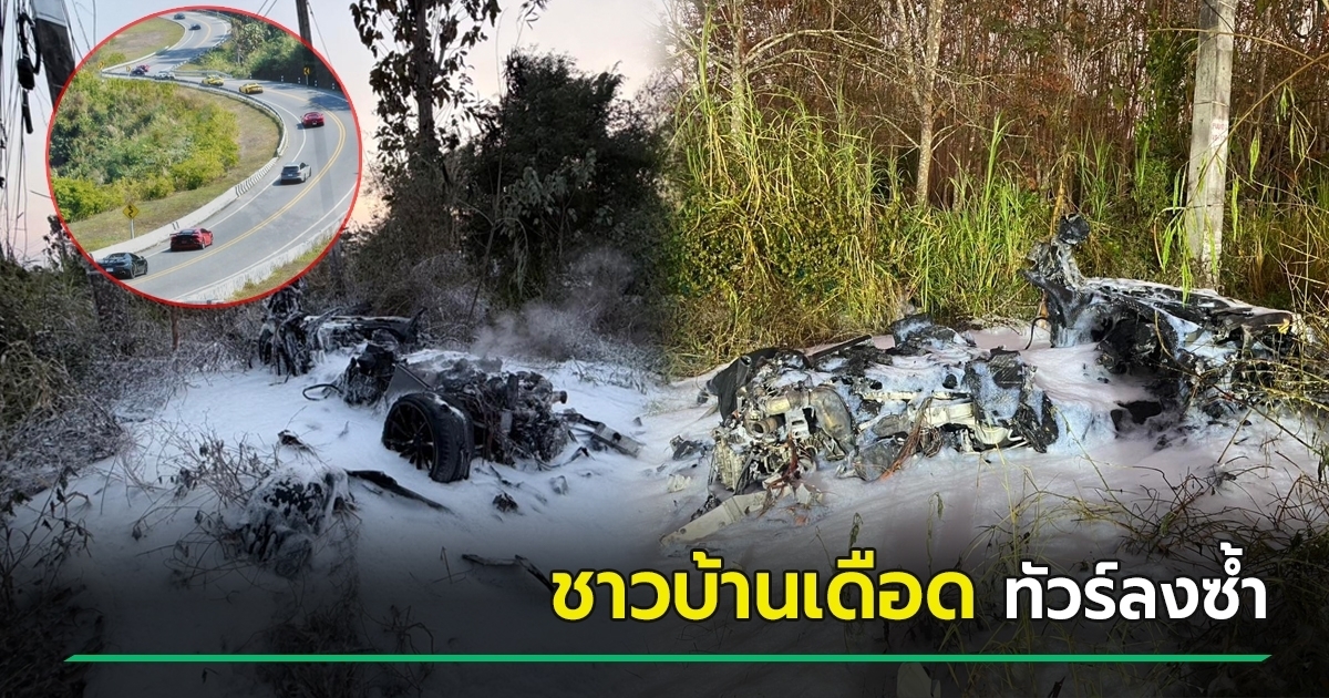 แก๊งซูเปอร์คาร์หรูรวมกลุ่มซิ่งเส้นทางภูเขาน่าน ก่อนจบไม่สวย รถเสียหลักไฟไหม้ทั้งคัน ด้านชาวบ้านแห่แฉขับสุดอันตราย