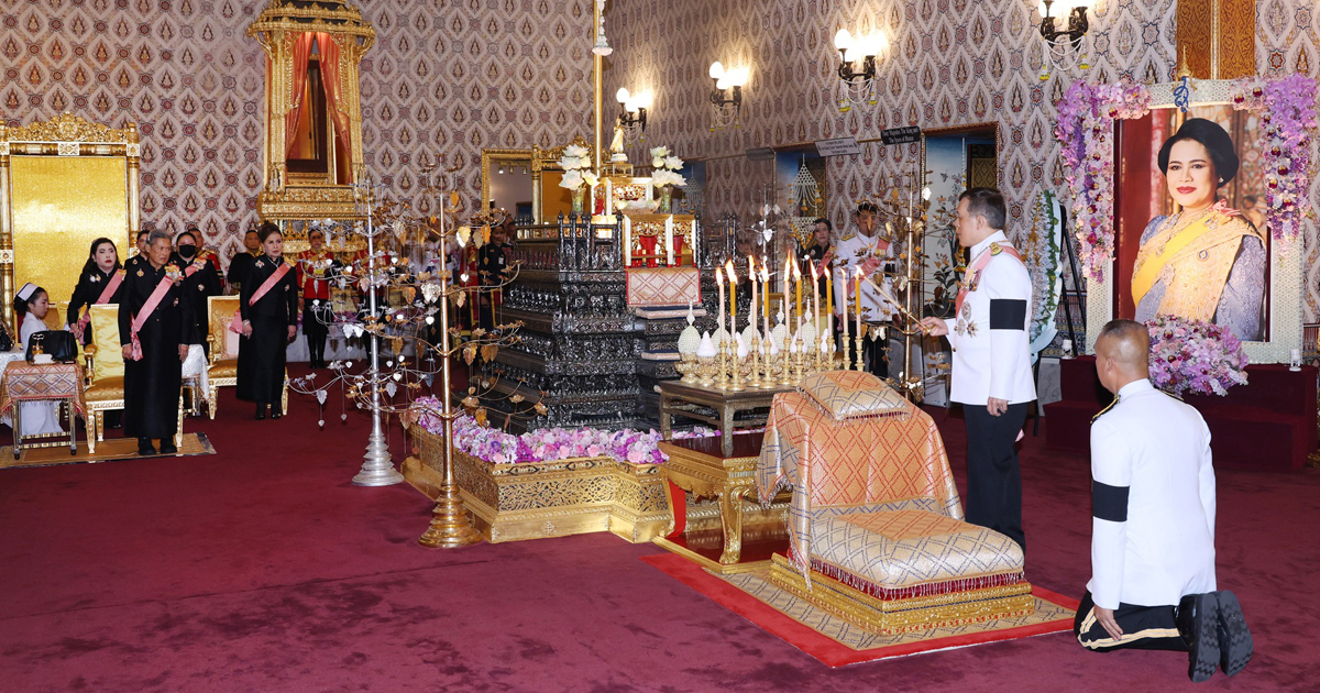เจ้าพนักงานประโคมสังข์ แตรงอน แตรฝรั่ง ปี่กลองชนะ ปี่พาทย์ ทหารกองเกียรติยศพระบรมศพถวายความเคารพ ดุริยางค์บรรเลงเพลงสรรเสริญพระบารมี จากนั้น พระบาทสมเด็จพระเจ้าอยู่หัว ทรงจุดธูปเทียนเครื่องราชสักการะทองลงยาราชาวดี และทรงจุดธูปเทียนเครื่องทองน้อย สมเด็จพระนางเจ้าฯ พระบรมราชินี ทรงจุดธูปเทียนเครื่องราชสักการะทองลงยารอง และทรงจุดธูปเทียนเครื่องทองน้อย