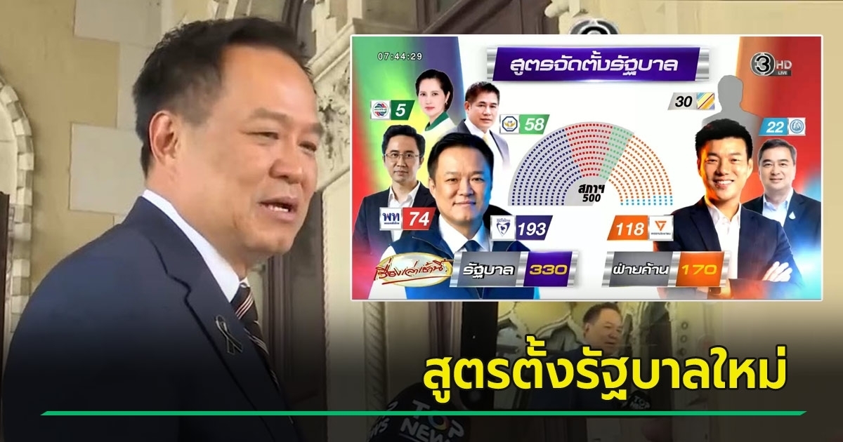 จับตาสูตรตั้งรัฐบาลใหม่ 4 พรรคใหญ่ผนึกกำลังโชว์ตัวเลขทะลุ 330 เสียง พร้อมหนุน อนุทินนั่งเก้าอี้นายกฯ มั่นใจมีเสถียรภาพอยู่ครบวาระ 4 ปี