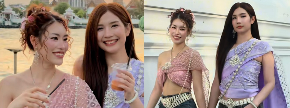 ผู้ใช้ TikTok @galaxy_janjan ได้เผยภาพสาวคนหนึ่ง เห็นเทรนด์ชุดไทยประยุกต์กำลังมาแรง เลยพาเพื่อนไปถ่ายรูปในกรุงเทพฯ แต่สิ่งที่ทำเอาเซอร์ไพรส์กว่าที่คิด ก็คือเพื่อนสาวคนนี้นี่แหละ ซึ่งแท้จริงนั้นเป็นแฟนหนุ่มของเธอนี่เอง หน้าสวยจนโดนแฟนจับแต่งหญิง และห่มสไบจนสวย ดูกลมกลืนเหมือนเป็นเพื่อนสาวจริง ๆ