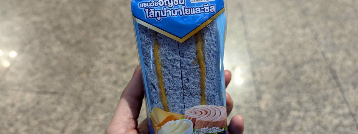ทวิตเตอร์ @another_tokyo ได้เผยภาพคนญี่ปุ่นเข้าเซเว่น อีเลฟเว่นในไทย เห็นแซนด์วิชไส้ทูน่ามาโยและชีส พร้อมกับแผ่นขนมปังสีฟ้า ดูแปลกตาจนต้องซื้อกลับบ้าน เพราะที่ญี่ปุ่นแทบไม่มีอะไรแบบนี้ให้เห็นเลย หลังจากที่ถ่ายรูปเอาลงโซเชียล ก็กลายเป็นไวรัลดัง จนพากันคิดไปไกลว่า เอาเนื้อของโดราเอมอนมาทำรึเปล่า แท้จริงนั้น ตัวขนมปังที่เป็นสีฟ้ามีส่วนผสมจากดอกอัญชันนั่นเอง