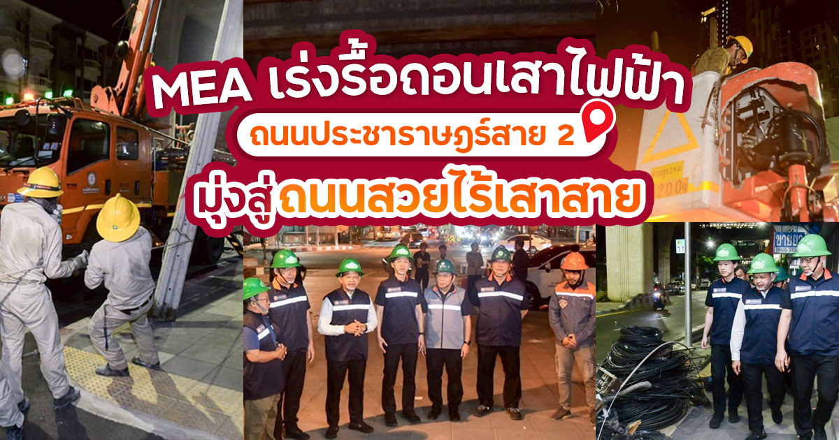 MEA รื้อถอนเสาไฟฟ้า-สายสื่อสาร บนถนนประชาราษฎร์สาย 2 ระยะทาง 1.4 กม. หลังเปลี่ยนเป็นสายไฟฟ้าใต้ดิน พร้อมคืนสภาพทางเท้า ปัจจุบันทำสายไฟฟ้าใต้ดินแล้ว 105.3 กม. ตั้งเป้า 317.3 กม. ภายในปี 2575 เสริมความมั่นคงพลังงานกรุงเทพฯ