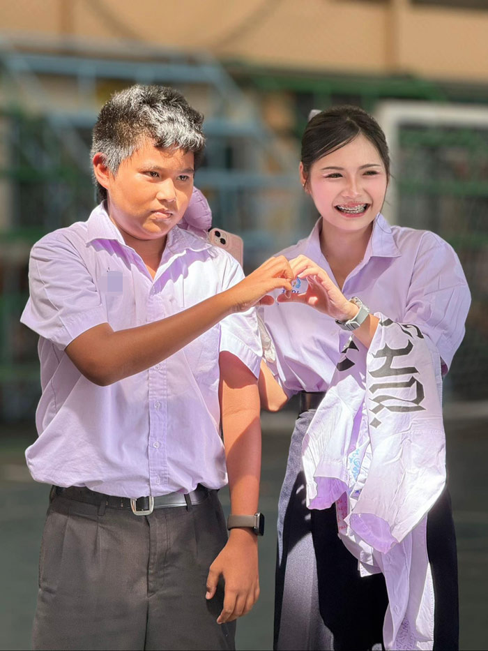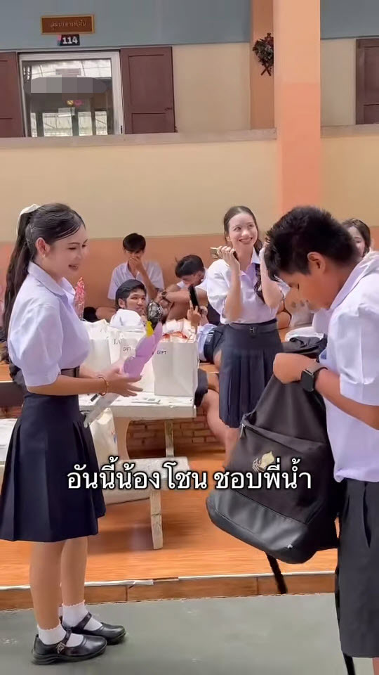 พร้อมกันนี้รุ่นพี่สาวยังเขียนข้อความเล่าความรู้สึกไว้ด้วยว่า "ดอกไม้คนแรกทุกงานเลยค่ะคนนี้ #พี่โชนกับน้องน้ำ น้อง ม.1 กับพี่ ม.6 เดี๋ยว 1 ปีจะกลับมาหาน้องดีไหมคะพี่ ๆ 5555"