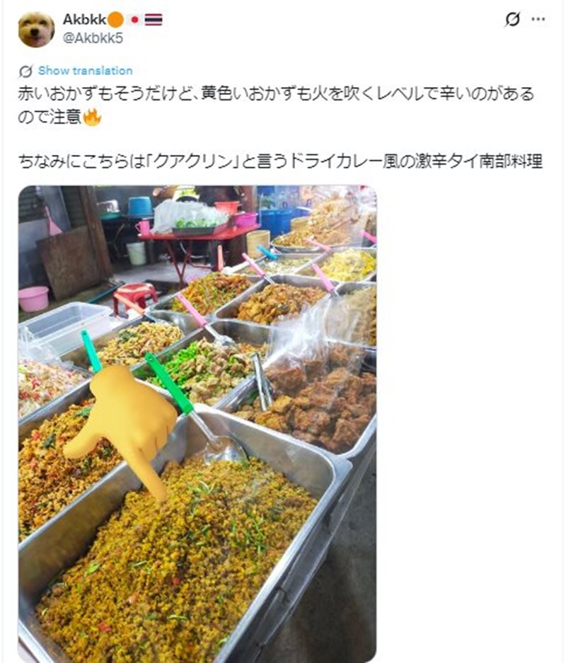 โดยชาวญี่ปุ่นรายนี้ได้โพสต์ภาพกับข้าว "เมนูสีเหลือง" ในร้านข้าวแกง พร้อมทั้งเขียนข้อความระบุว่า "ไม่ใช่แค่กับข้าวสีแดงเท่านั้น แต่กับข้าวสีเหลืองบางอย่างก็เผ็ดมากจนลมหายใจแทบจะพ่นไฟได้เลย ระวังด้วยนะ อ้อ แล้วสิ่งนี่เรียกว่า คั่วกลิ้ง เป็นอาหารใต้รสเผ็ดจัดจ้านแบบแกงแห้ง"