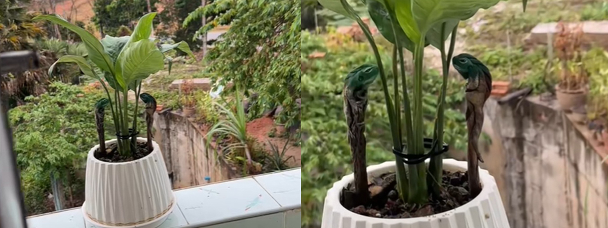 ผู้ใช้ TikTok @somwang_25448 ได้เผยภาพตอนไปดูกระถางต้นไม้ตรงระเบียงบ้าน ตอนแรกคิดว่ากระถางต้นไม้ธรรมดา ยิ่งซูมดูแบบใกล้ ๆ เห็นบางอย่างแปลก ๆ อยู่ในกระถางด้วย ก่อนรู้ว่า สกิลการพรางตัวขั้นเทพของกิ้งก่า ทำให้สีผิวและลวดลายมีความกลมกลืนกับกิ่งไม้จนแทบแยกไม่ออก แถมยังเกาะนิ่งสนิท ไม่ขยับไปไหนเลยด้วย