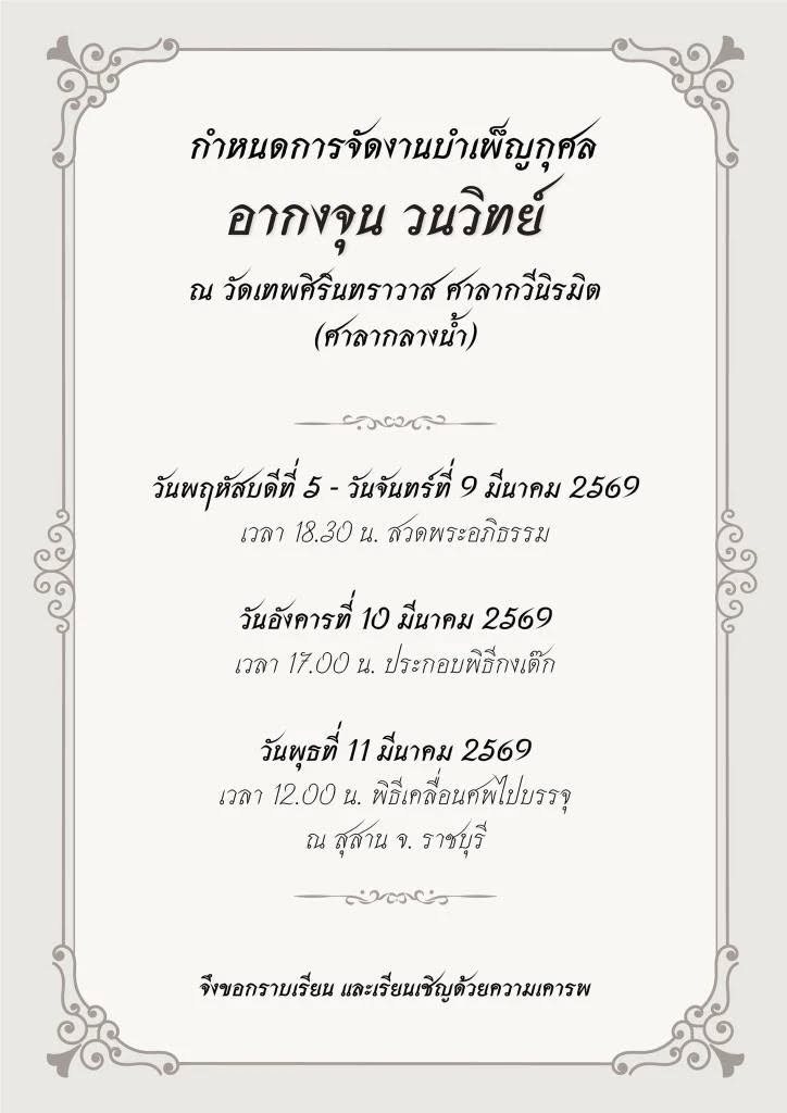 โดยกำหนดการจัดงานบำเพ็ญกุศล อากงจุน วนวิทย์ จัดขึ้น ณ วัดเทพศิรินทราวาส ศาลากวีนิรมิต (ศาลากลางน้ำ) โดยจะมีพิธีสวดพระอภิธรรมวันที่ 5-9 มีนาคม เวลา 18.30 น. จากนั้นวันที่ 10 มีนาคม ประกอบพิธีกงเต๊ก และวันที่ 11 มีนาคม จะมีพิธีเคลื่อนศพไปบรรจุ ณ สุสาน จ.ราชบุรี