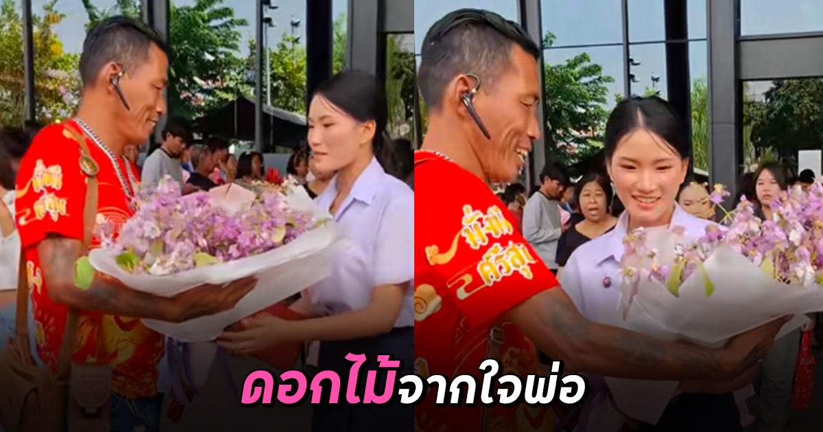 ดอกไม้งามจากใจพ่อ พ่อเก็บดอกไม้ที่ลูกชอบจากข้างทาง เอามาให้ในวันเรียนจบ