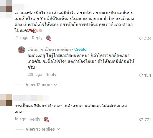 อย่างไรก็ดี อีกส่วนไม่เข้าใจว่าทำไมคลิปนี้ถึงมีดราม่า พร้อมทั้งปกป้องและให้กำลังใจ "เจ้าของช่องผิดไร งง เค้าแค่มีน้ำใจ อยากให้ อยากแบ่งปัน แค่นั้นป่ะ คอมเมนต์เป็นไรเอ่ย ? คลิปนี้ไม่เห็นอะไรเลยนะ นอกจากน้ำใจของเจ้าของช่อง เป็นกำลังใจให้นะคะ อย่าท้อกับการทำดีนะ คุณทำดีแล้ว ทำต่อไปนะคะ"