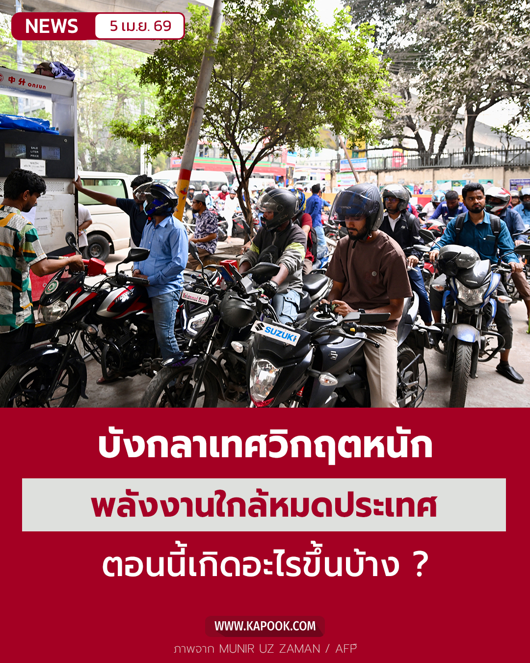 วันที่ 3 เมษายน 2569 สำนักข่าวรอยเตอร์ รายงานสถานการณ์ในประเทศบังกลาเทศ ซึ่งกำลังเผชิญกับวิกฤตด้านพลังงานอย่างรุนแรง จนอาจจะกลายเป็นประเทศแรกที่เชื้อเพลิงหมดประเทศ อันเป็นผลกระทบมาจากสงครามระหว่างสหรัฐฯ และอิหร่าน ความขัดแย้งในตะวันออกกลางส่งผลกระทบต่อตลาดเชื้อเพลิงโลก และทำให้เกิดความตึงเครียดทางเศรษฐกิจทั่วโลก