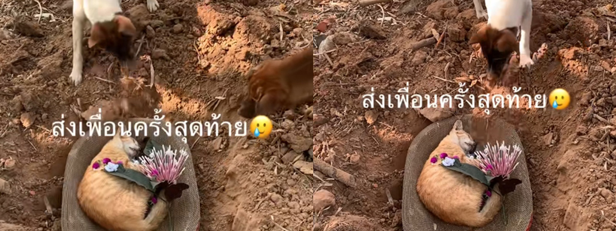 ผู้ใช้ TikTok @patayayear ได้เผยภาพความเป็นเพื่อนคนละสายพันธุ์ ที่ทำชาวเน็ตกลั้นน้ำตาไม่อยู่ เมื่อเหล่าแก๊งหมามาส่งเพื่อนที่เป็นแมว กลับดาวครั้งสุดท้าย หลังจากที่เอาร่างไร้วิญญาณวางในหลุมดิน พวกมันพยายามใช้จมูกกลบดิน เพื่อฝังร่างเพื่อนด้วยความรัก ระหว่างนั้นก็มีเช็กอย่างมีความหวังว่า จะมีโอกาสฟื้นกลับมาไหม