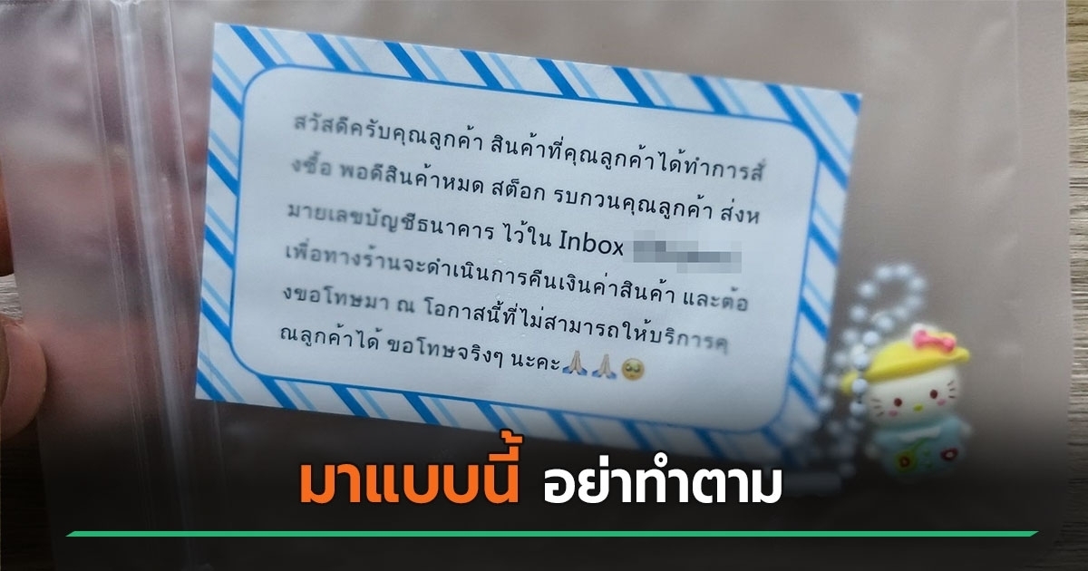 วันที่ 13 เมษายน 2569 ผู้ใช้เฟซบุ๊กรายหนึ่ง เล่าประสบการณ์การสั่งของผ่านแอปฯ ออนไลน์ชื่อดัง แต่ทางร้านกลับส่งกระดาษมาให้ เขียนว่า สินค้าหมดสต๊อก รบกวนลูกค้าส่งหมายเลขบัญชีธนาคารมาที่ Inbox ของร้าน เพื่อที่จะคืนเงินให้โดยตรง พร้อมกับขอโทษมา ณ ที่นี้