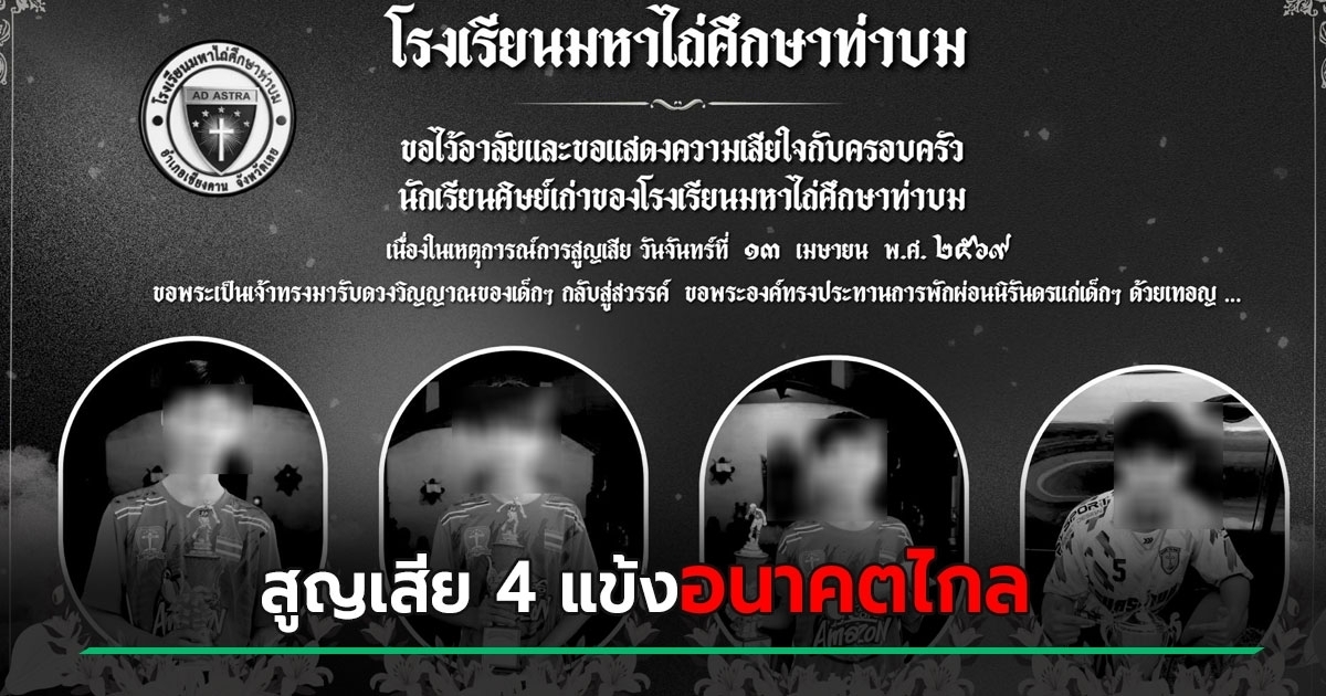 อุบัติเหตุ กระบะเมาซิ่งพุ่งชนรถจักรยานยนต์ของกลุ่มนักฟุตบอลเยาวชนดับสลด 4 ศพ ด้านคนขับคล้ายอาการมึนเมา ขณะที่โรงเรียนโพสต์ไว้อาลัยเศร้า