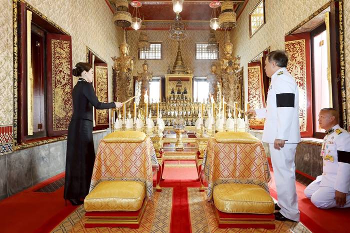 พระบาทสมเด็จพระเจ้าอยู่หัว ทรงจุดธูปเทียนเครื่องราชสักการะทองลงยาราชาวดี และทรงจุดธูปเทียนเครื่องทองน้อยที่หน้า พระแท่นพระนพปฎลมหาเศวตฉัตร ทรงกราบถวายบังคมพระบรมอัฐิ และพระอัฐิ สมเด็จพระนางเจ้าฯ พระบรมราชินี ทรงจุดธูปเทียนเครื่องราชสักการะทองลงยารอง และทรงจุดธูปเทียน เครื่องทองน้อยที่หน้าพระแท่น พระนพปฎลมหาเศวตฉัตร ทรงกราบถวายบังคมพระบรมอัฐิ และพระอัฐิ