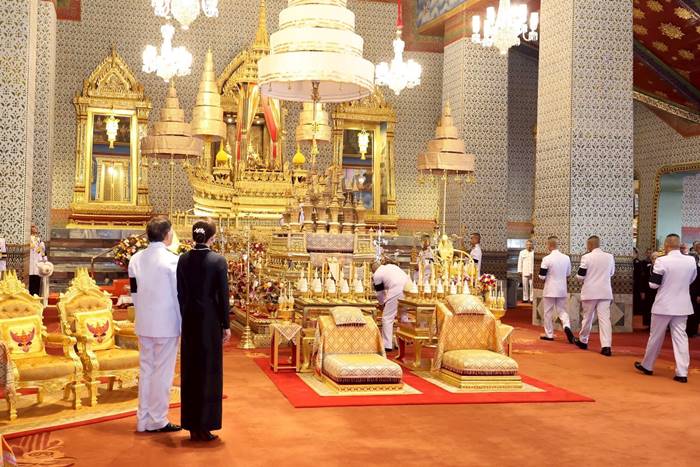 จากนั้น เสด็จพระราชดำเนินไปทรงกราบพระพุทธรูปประจำพระชนมวาร รัชกาลที่ 1 – รัชกาลที่ 9 ที่หน้าพระที่นั่งบุษบกมาลา ทรงกราบพระบรมอัฐิ และพระอัฐิที่หน้าพระแท่นพระนพปฎลมหาเศวตฉัตร ทรงรับการถวายความเคารพของผู้มาเฝ้าทูลละอองธุลีพระบาท แล้วเสด็จออกจากพระที่นั่งอมรินทรวินิจฉัย ไปประทับรถยนต์พระที่นั่ง เสด็จพระราชดำเนินกลับ