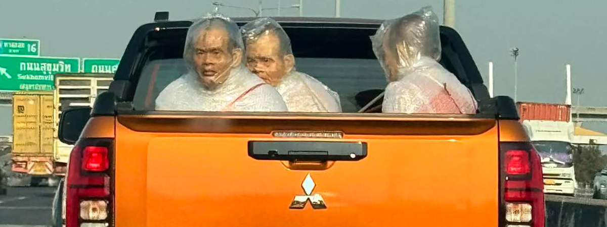 เฟซบุ๊ก Jobby ได้เผยเรื่องราวระหว่างขับรถเดินทางไปข้างนอก ขับอยู่ดี ๆ ดันไปเห็นคนนั่งท้ายกระบะ เอาถุงพลาสติกคลุมหัว แวบแรกคิดว่าจะกันแดด หรือไม่ก็ฝุ่น PM 2.5 หลังจากที่ได้เห็นใกล้ ๆ แทบขยี้ตาแรง ที่แท้รถคันข้างหน้าเขาขนหุ่นขี้ผึ้งพระไปนี่เอง ถ้าเห็นตอนกลางคืน แอบหลอนอยู่เหมือนกัน