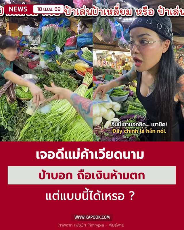 วันที่ 18 เมษายน 2569 เมื่อเร็ว ๆ นี้ คลิปวิดีโอของ พิมรี่พาย แม่ค้าออนไลน์ชื่อดัง ได้กลายเป็นประเด็นไวรัลร้อนแรงบนโซเชียลมีเดีย ภายหลังจากเธอไปเที่ยวเวียดนาม และได้ไปซื้อผักที่ตลาด แต่กลับเจอแม่ค้าเหลี่ยมจัด ทำเนียนปัดเงินเธอตกจากมือ ก่อนจะยึดเอาเป็นของตัวเอง โดยอ้างว่าถือเงินห้ามตก เพราะเงินที่ตกจะถือว่าไม่มีเจ้าของ