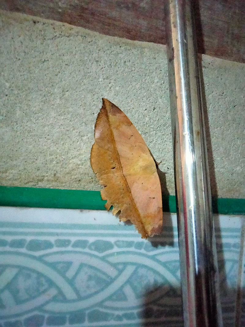 ภาพดังกล่าวเผยให้เห็นบางอย่างคล้ายใบไม้แห่ง แต่กลับติดอยู่กับผนังได้ ที่แท้คือผีเสื้อสีน้ำตาลซึ่งมีลวดลายบนปีกมีทั้งเส้นกลางใบ รอยแห้งกรอบ และขอบที่ดูเหมือนใบไม้จริงอย่างมาก หากไม่สังเกตการวางตัวหรือรูปทรงให้ดี แทบไม่มีทางรู้ว่าเป็นแมลง