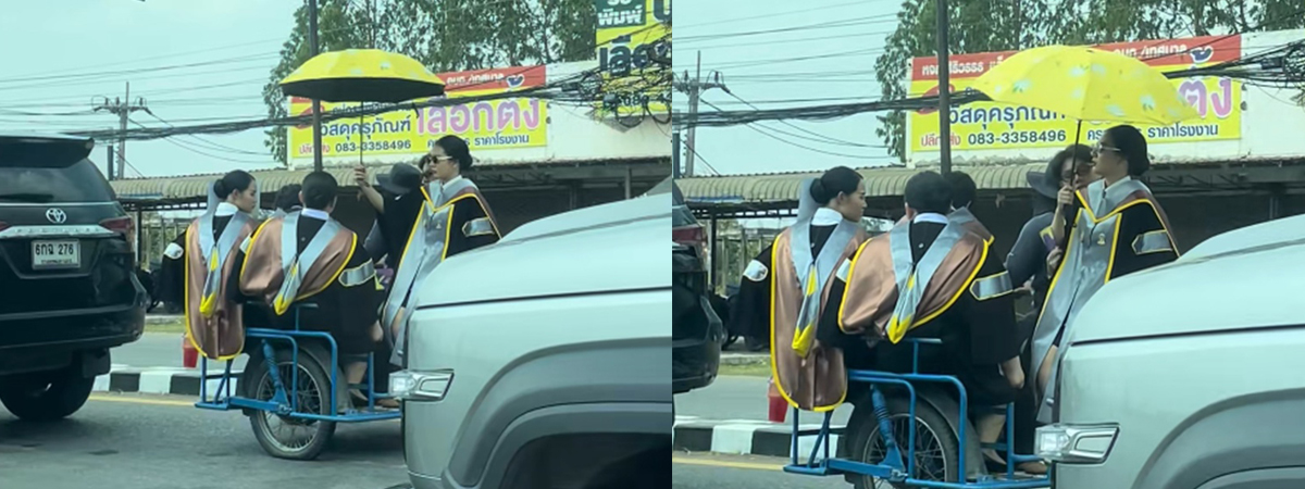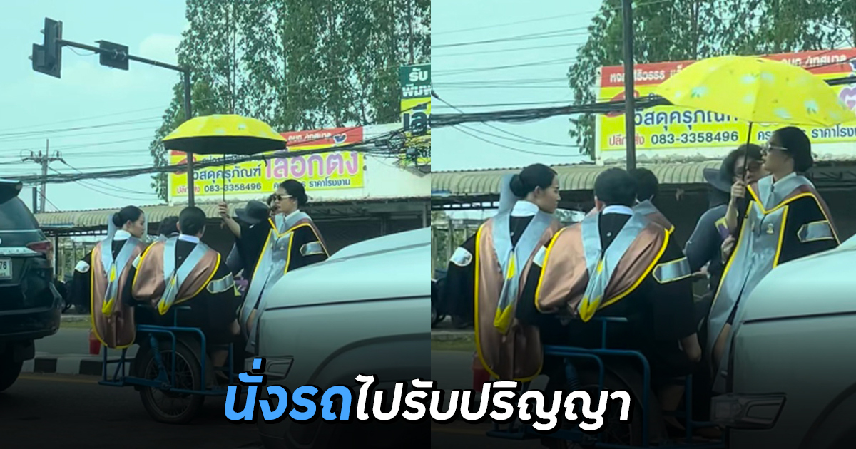 ผู้ใช้ TikTok @tak_der ได้เผยภาพน้อง ๆ นักศึกษาจากมหาวิทยาลัยมหาสารคาม ที่เพิ่งเรียนจบหมาด ๆ แต่งชุดครุยพร้อมเสื้อผ้าหน้าผมแบบจัดเต็ม นั่งรถซาเล้งไปเข้าพิธีรับปริญญา นอกจากจะสร้างสีสันบนถนนแล้ว ชาวเน็ตต่างพุ่งเป้าไปที่ยางรถ กลัวว่าจะไปไม่ถึงงาน ยางแบนจนต้องบอกให้ไปเติมลมก่อน