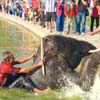 เจ้าหน้าที่ใช้เชือกขนาดใหญ่คล้องไปที่คอช้างแล้วใช้กำลังคนกว่า 20 คนค่อยๆ ลากพยุงมาที่สะพานทางเข้าศาลเจ้าพ่อหลักเมือง ซึ่งเป็นขอบสะพานบริเวณที่น้ำตื้นที่สุด เมื่อมาถึงบริเวณดังกล่าวลูกช้างจึงได้เหยียบก้อนหินริมฝั่งยันกายขึ้นฝั่งได้อย่างปลอดภัย ท่ามกลางเสียงโห่ร้องและปรบมือแสดงความดีใจของชาวบ้านที่มาให้กำลังใจจำนวนมาก
