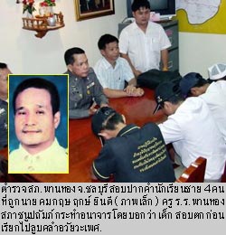 เมื่อเวลา 12.00 น. วันที่ 12 มีนาคม นายเอี่ยม จึงประเสริฐ นายกสมาคมผู้ปกครอง โรงเรียนพานทองสภาชนูปถัมภ์ อ.พานทอง จ.ชลบุรี พานักเรียนชายอายุ 15-17 ปี รวม 4 คน ประกอบด้วย นายเบล (นามสมมติ) อายุ 17 ปี นักเรียนชั้น ม.6 นายปู (นามสมมติ) อายุ 16 ปี เรียนอยู่ชั้น ม.3/5 นายเอ (นามสมมติ) อายุ 15 ปี เรียนอยู่ชั้น ม.3/5 และนายดล (นามสมมติ) อายุ 15 ปี เรียนอยู่ชั้น ม.3/5 เข้าพบ พ.ต.อ.ณพล นามนารถ ผกก.สภ.พานทอง พ.ต.ท.จตุวัฒน์ กิ่งบัวหลวง รอง ผกก.สส. และ พ.ต.ท. คมพล ขำคม พนักงานสอบสวนว่า เด็กนักเรียนทั้ง 4 คน ถูกนายคมกฤษ ฤกษ์ยินดี อายุ 46 ปี ครูสอนวิชาศิลปะของโรงเรียนดังกล่าวกระทำอนาจาร สอบถามเด็กทราบว่า เมื่อวันที่ 10 มีนาคม นายคมกฤษเรียกเด็กนักเรียนชายที่สอบวิชาศิลปะไม่ผ่านเข้าไปพบในห้อง แล้วให้ถอดกางเกงลูบคลำอวัยวะเพศ อีกทั้งยังให้ยืนสำเร็จความใคร่ให้ดู และใช้กล้องดิจิตอลถ่ายรูปเก็บไว้ด้วย