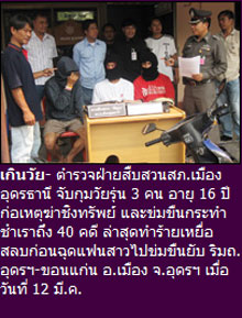 ตร.อุดรธานีรวบ 3 โจ๋แสบก่อคดีรุมยำหนุ่มแล้วฉุดแฟนสาวไปรุมโทรมในป่าละเมาะข้างทาง เผยเหยื่อสาวกำลังยืนทะเลาะกับแฟนหนุ่มอยู่ ปรากฏว่ามีคนร้ายวัยรุ่น 3 คนกรูเข้าใช้ไม้ทุบผู้ชายจนสลบแล้วฉุดผู้หญิงไปขืนใจจนครบ ตร. บุกเข้าไปตะครุบตัวได้ครบแก๊งทั้ง 3 คนคาบ้านพัก สอบสวนถึงผงะก่อคดีขืนใจเหยื่อสาวมากว่า 40 ราย ปล้นฆ่าเหยื่อผู้ชายอีก 2 ศพ โดยจะใช้ท่อนไม้ฟาดหัวจนแน่นิ่งแล้วชิงทรัพย์ ถ้ามากับผู้หญิงก็จะฉุดไปรุมโทรม สารภาพไม่สะท้านก่อคดีขืนใจมาตั้งแต่อยู่ ป.6